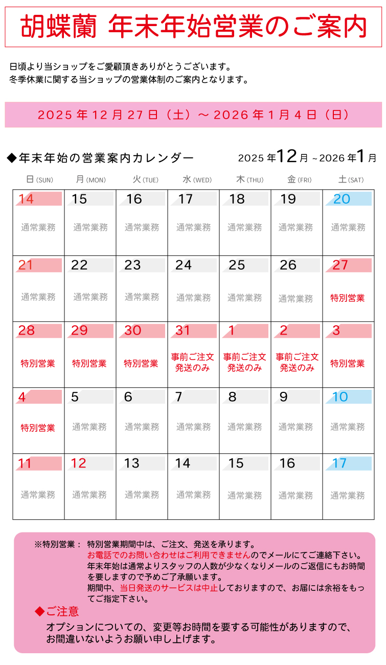 2026年1月1日より、胡蝶蘭本体価格および各種オプション費用の改定(値上げ)を実施 させていただく運びとなりました。